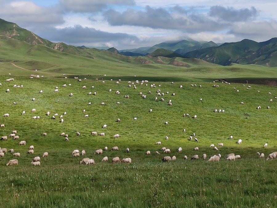 青海省の久治に向かう國道345號はすばらしい景観の道でした。羊が放牧され、緑のキャンパスの中に規(guī)則的に白い點のように羊が群れていました。どこからか“草原情歌”の歌聲が聞こえてきそうな風景でした。