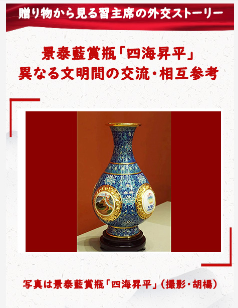 「四海昇平」には世界平和と共同発展を望む思いが託されている?!附袢瘴摇─銞思蓼盲郡韦?、協(xié)力を強化し、翼を広げて共に飛翔し、アジア太平洋の発展の新たなビジョンを描くことが目的だ」と習(xí)主席は語った。景泰藍賞瓶は小さいものの、複雑な工程を経て作られる。習(xí)主席は景泰藍について「中華民族の悠久の歴史と現(xiàn)代の文明を示すだけでなく、異なる文明?文化間の交流、相互參考、包摂、共に進歩することも體現(xiàn)している」と紹介した。