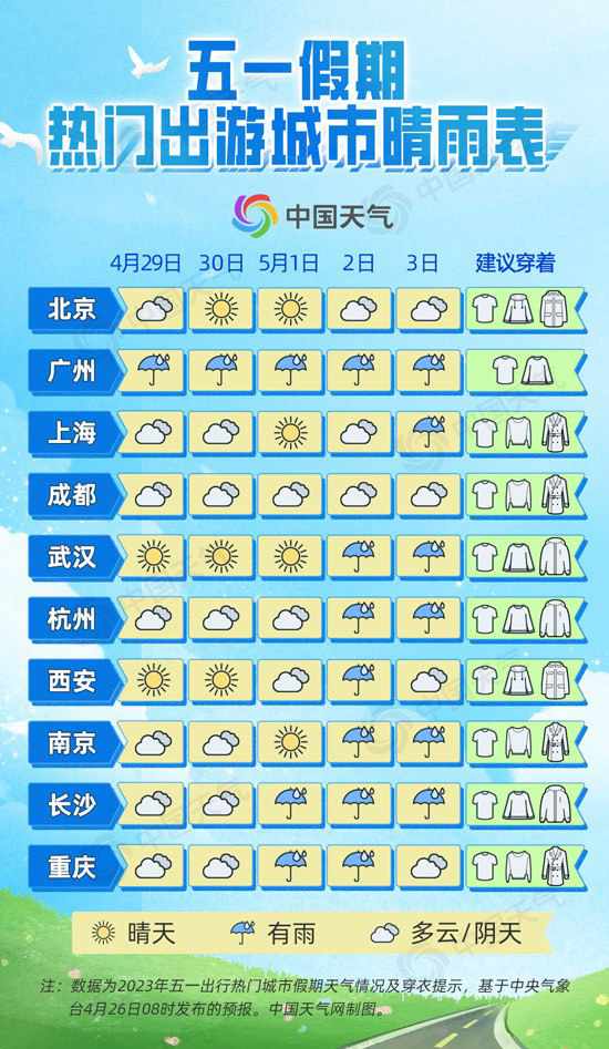 目前に控えたメーデー5連休には、旅行に出かけるという人が非常に多くなりそうだ。そこで気になってくるのは連休中の天気ではないだろうか?中國天気網(wǎng)はこのほど、メーデー天気マップ、人気観光都市10都市の天気予報、行き先別服裝コーデを発表した。旅行や行楽に出かける際は、どんな服裝をしたらよいか、傘などが必要かをチェックしておこう。中國天気網(wǎng)が報じた。