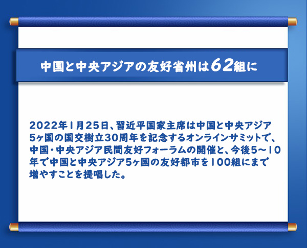 2022年1月25日、習(xí)近平國家主席は中國と中央アジア5ヶ國の國交樹立30周年を記念するオンラインサミットで、中國?中央アジア民間友好フォーラムの開催と、今後5~10年で中國と中央アジア5ヶ國の友好都市を100組にまで増やすことを提唱した。(編集NA)