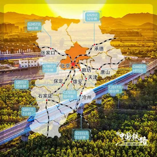 天津だけでなく、北京から河北省の大半の地級(jí)市(省と県の中間にある行政単位)までの乗車時(shí)間が最短で1時(shí)間以內(nèi)になっている。北京から高速鉄道に乗れば、廊坊へ21分、張家口へ48分、承徳へ52分、石家荘へ1時(shí)間で到著することができる。