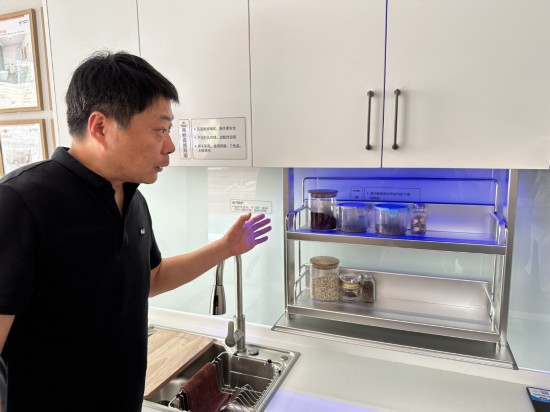 キッチンでは、タッチセンサーで昇降するつり棚がコミュニティ住民の姜秀萍さんの目を釘付けにした。姜さんが手を棚の方に出しただけで、調(diào)味料を入れたつり棚がするすると降りてきた。高齢の見學(xué)者は「これは思いがけなかった」とびっくりしつつ、「年を取ると高いところが怖くなるし、物を取るのも大変だ。キッチンにセンサー裝置があれば、手を伸ばしただけで棚がひとりでに降りてきて、大いに手間が省ける」と嬉しそうに話した。設(shè)計(jì)責(zé)任者の趙元輝さんは、「高齢者だけでなく、車いすを使う障がい者にとっても使いやすい」と話した。