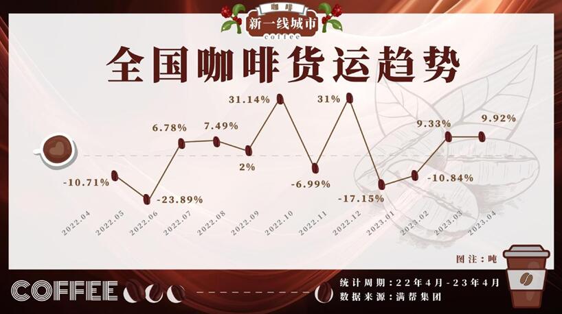 最近の數(shù)年間、コーヒー産業(yè)は大きく上昇してきた。満幇のデータでは、2022年のコーヒー輸送量は10月と12月にピークを迎え、特に12月は前月比30%以上増加した。23年3月には、都市部のオフィスビルで企業(yè)活動(dòng)が再開(kāi)されたのにともなって、コーヒー輸送量も急速に回復(fù)した。