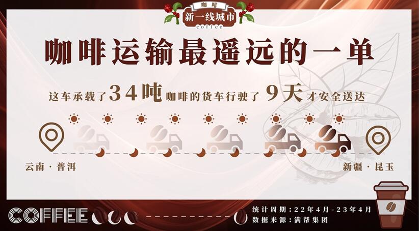 遙か遠(yuǎn)い距離も、雲(yún)南コーヒーに対する消費(fèi)者の愛(ài)を冷ますことはない。満幇の貨物輸送受注データを見(jiàn)ると、最も遠(yuǎn)距離のコーヒー輸送は雲(yún)南省普洱市から新疆維吾爾(ウイグル)自治區(qū)昆玉市へのもので、はるばる7000キロメートル以上に達(dá)したという。