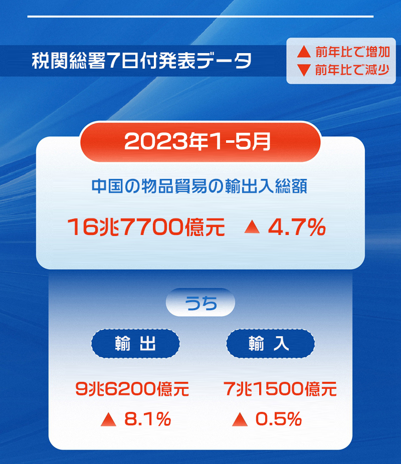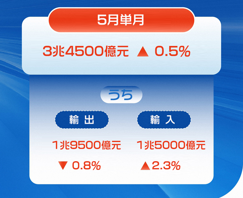 詳しく見ると、1-5月の輸出は同8.1%増の9兆6200億元、輸入は同0.5%増の7兆1500億元、5月の輸出は同0.8%減の1兆9500億元、輸入は同2.3%増の1兆5000億元だった。