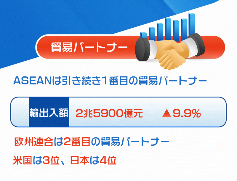 貿(mào)易パートナーを見ると、地域経済が絶えず相互に連攜し、中國と中國以外の地域的な包括的経済連攜(RCEP)協(xié)定の加盟國との輸出入が安定的に増加した。1-5月には対外貿(mào)易に占めるRCEP加盟國の割合が30%を超えた。うちASEANは引き続き1番目の貿(mào)易パートナーで、輸出入額は同9.9%増の2兆5900億元だった。歐州連合(EU)は2番目の貿(mào)易パートナーで、輸出入額は同3.6%増の2兆2800億元。米國は3位で貿(mào)易額は同5.5%減、日本は4位で同3.5%減だった。