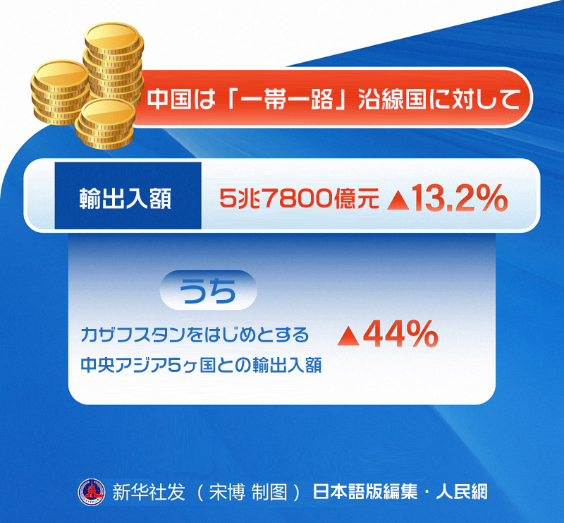 1-5月の中國と「一帯一路」(the Belt and Road)沿線國との輸出入額は同13.2%増の5兆7800億元となり、そのうちカザフスタンをはじめとする中央アジア5ヶ國との輸出入額は同44%増と大幅に増加した。(編集KS)