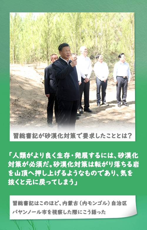 習(xí)総書記は砂漠化対策を現(xiàn)地で視察した際、「人類がより良く生存?発展するには、砂漠化対策が必須だ。砂漠化対策は転がり落ちる巖を山頂へ押し上げるようなものであり、気を抜くと元に戻ってしまう」とし、砂漠化対策は長期的な歴史的課題であり、しっかりと取り組み続ける必要があると強(qiáng)調(diào)した。