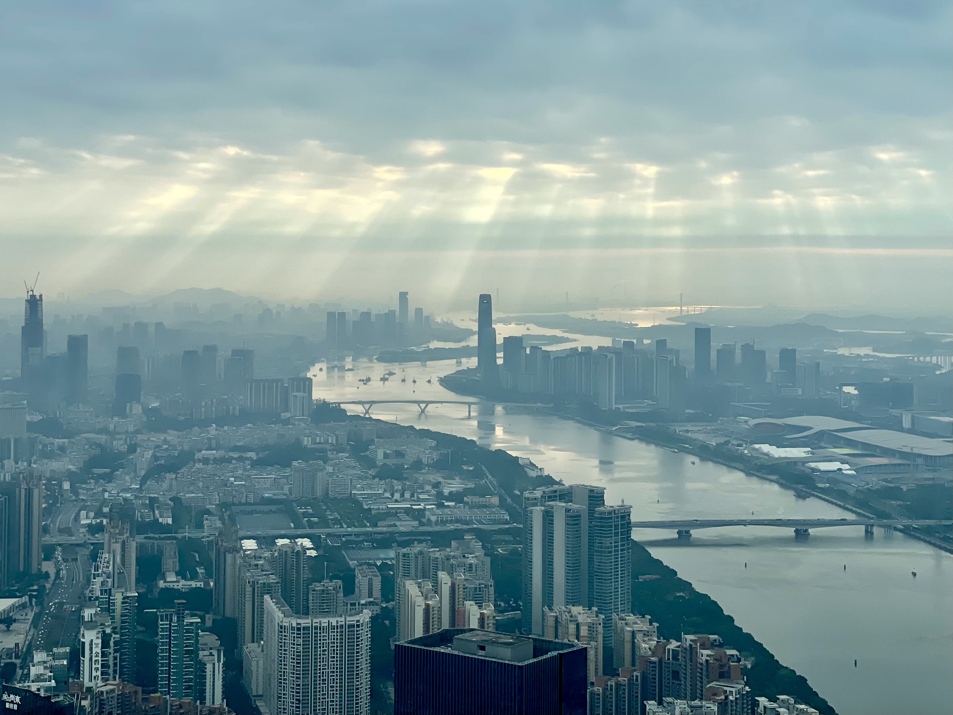 雨上がりの珠江に、いくつもの光の柱が降り注いでいました!
