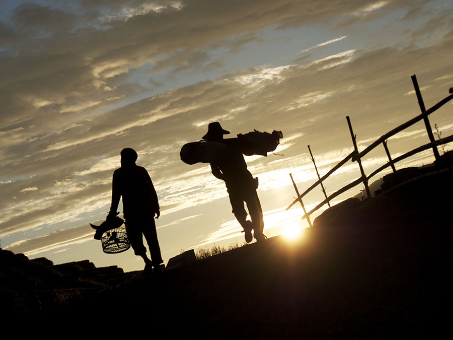 鳥かごを大事に抱えて農(nóng)作業(yè)に出かける農(nóng)夫たち。