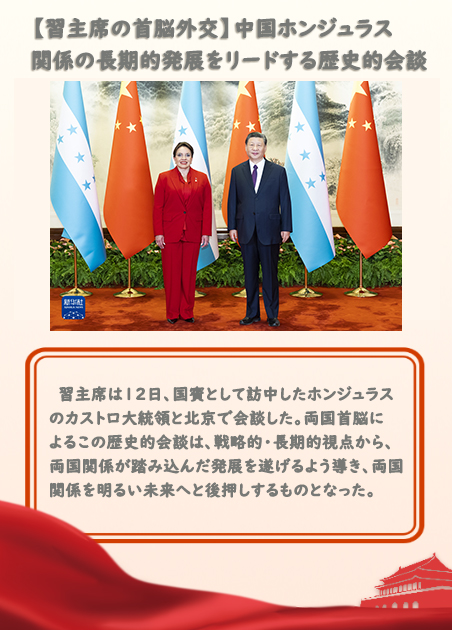 習(xí)近平國家主席は12日、國賓として訪中したホンジュラスのカストロ大統(tǒng)領(lǐng)と北京の人民大會(huì)堂で會(huì)談した。両國首脳によるこの歴史的會(huì)談は、戦略的?長期的視點(diǎn)から、両國関係が踏み込んだ発展を遂げるよう導(dǎo)き、両國関係を明るい未來へと後押しするものとなった。新華社が伝えた。