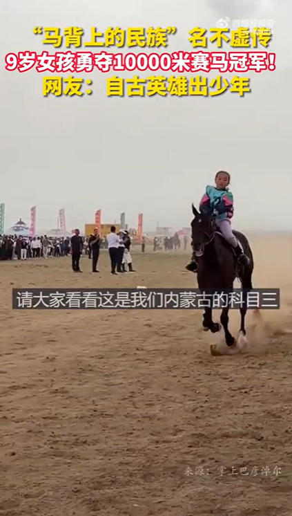 7月1日、內蒙古(內モンゴル)自治區(qū)巴彥淖爾(バヤンノール)市烏拉特(ウラド)中旗で、蒙古(モンゴル)族の9歳の女の子が10000メートルの乗馬のレースで優(yōu)勝した。この女の子が「乗馬歴は4年。今回は5周で10000メートル走り、1位になった」と淡々と話す様子に、ネットユーザーからは「さすが馬上の民族」と感嘆の聲が上がった。(編集KS)