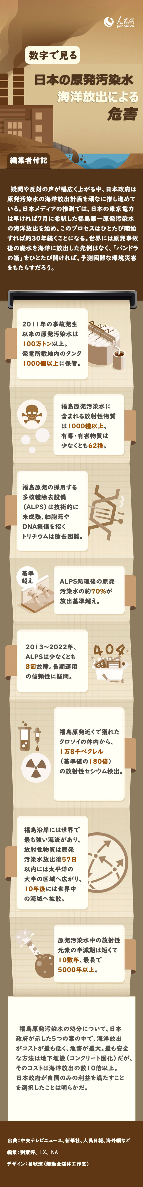 疑問や反対の聲が幅広く上がる中、日本政府は原発汚染水の海洋放出計(jì)畫を頑なに推し進(jìn)めている。日本メディアの推測では、日本の東京電力は早ければ7月に希釈した福島第一原発汚染水の海洋放出を始め、このプロセスはひとたび開始すれば約30年続くことになる。世界には原発事故後の廃水を海洋に放出した先例はなく、「パンドラの箱」をひとたび開ければ、予測困難な環(huán)境災(zāi)害をもたらすだろう。