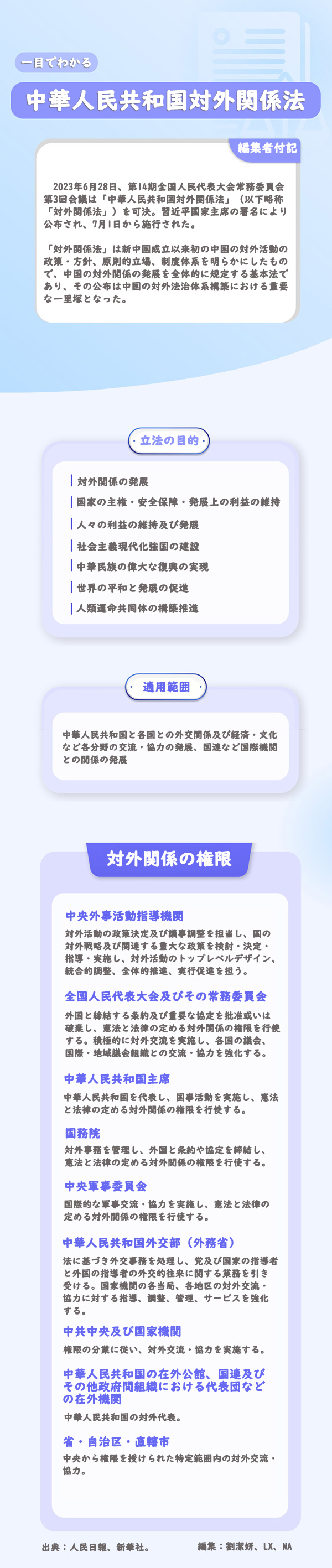 2023年6月28日、第14期全國(guó)人民代表大會(huì)常務(wù)委員會(huì)第3回會(huì)議は「中華人民共和國(guó)対外関係法」(以下略稱「対外関係法」)を可決。習(xí)近平國(guó)家主席の署名により公布され、7月1日から施行された。
