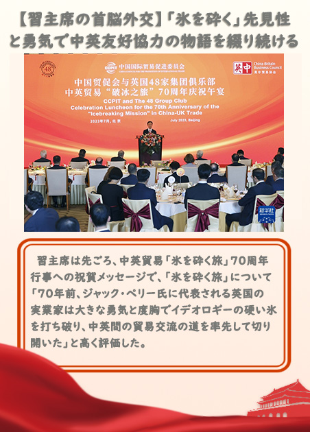 70年前、英國経済界の識者はイデオロギーの硬い氷を打ち破り、中英貿(mào)易の「氷を砕く旅」を切り開いた。習(xí)近平國家主席は先ごろ、中英貿(mào)易「氷を砕く旅」70周年行事への祝賀メッセージで、「氷を砕く旅」について「70年前、ジャック?ペリー氏に代表される英國の実業(yè)家は新中國の明るい將來性と中英協(xié)力の多大な潛在力を鋭く見抜き、大きな勇気と度胸でイデオロギーの硬い氷を打ち破り、中英間の貿(mào)易交流の道を率先して切り開いた」と高く評価した。新華網(wǎng)が伝えた。