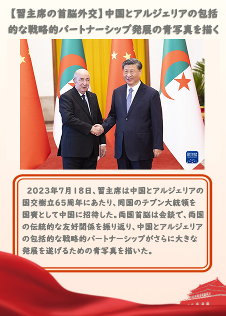 2023年7月18日、習(xí)近平國(guó)家主席は中國(guó)とアルジェリアの國(guó)交樹立65周年にあたり、同國(guó)のテブン大統(tǒng)領(lǐng)を國(guó)賓として中國(guó)に招待した。両國(guó)首脳は會(huì)談で、両國(guó)の伝統(tǒng)的な友好関係を振り返り、中國(guó)とアルジェリアの包括的な戦略的パートナーシップがさらに大きな発展を遂げるための青寫真を描いた。新華社が伝えた。