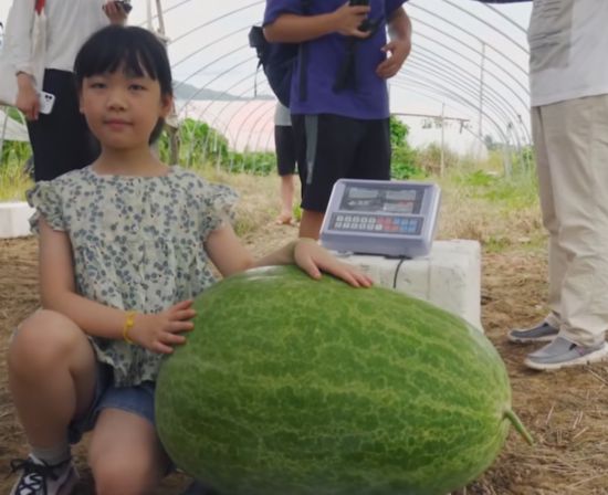 昨年、浙江省で一番重いスイカを作ったのも滕さんで、重さは32.1キロだった。そして今年、公証人が見守る中、滕さんが作ったスイカの重さを量ると、昨年より6.92キロも重い39.02キロだった。