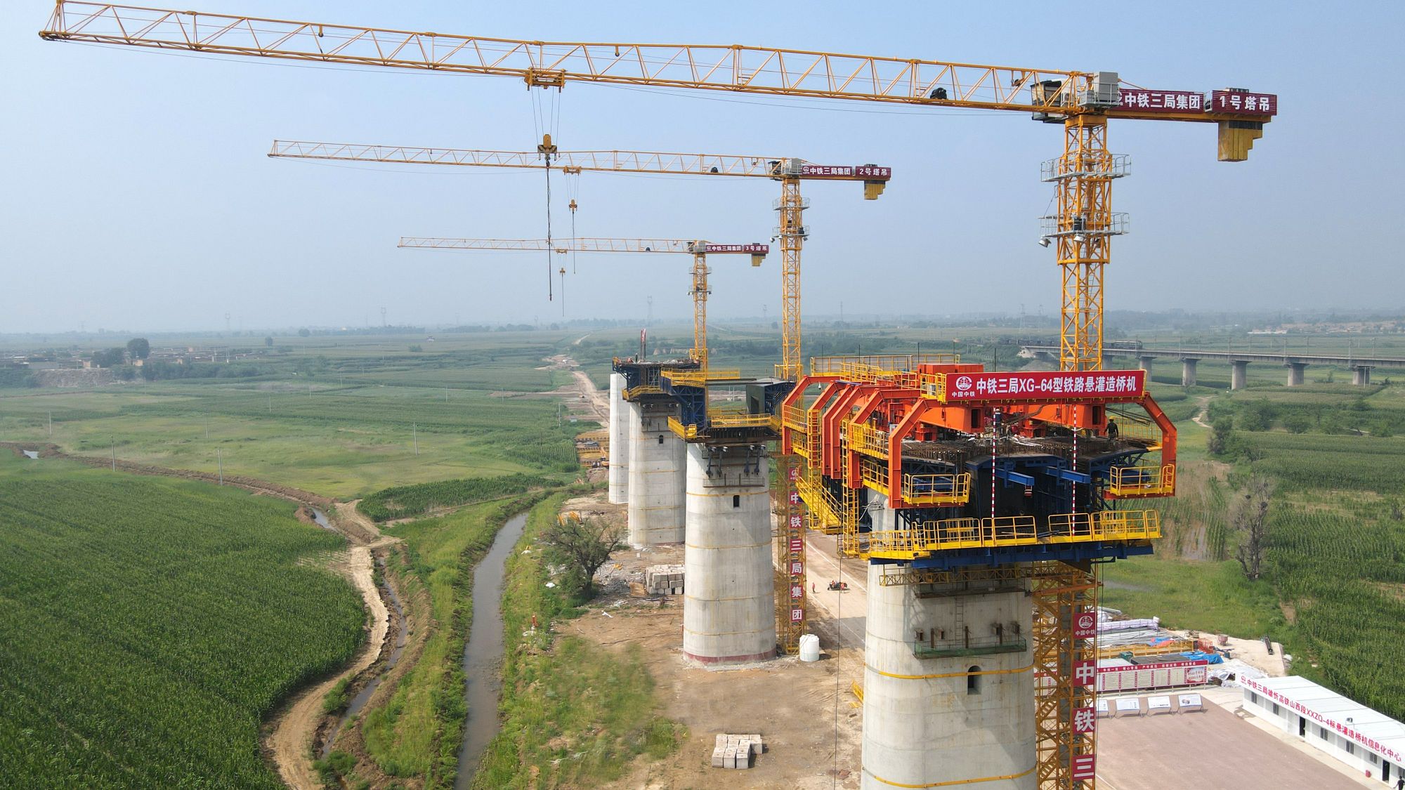 橋梁架設(shè)の安全で効率的な推進(jìn)を保証するべく、中鉄三局は中鉄第五勘察設(shè)計(jì)院集団有限公司と共同でXG-64型デッキトラス構(gòu)造カンチレバー橋梁架設(shè)裝置を開発し、そして初めて雄忻高速鉄道山西區(qū)間で使用した。同橋梁架設(shè)裝置は中國(guó)最先端の橋梁建設(shè)機(jī)械の一つで、より軽量化?スマート化されている。同建設(shè)機(jī)械は移動(dòng)架臺(tái)、型枠、電子制御液圧、安全防護(hù)、情報(bào)化、スマート制御などの各システムからなり、スパンと斷面の異なる連続梁の施工に使用できる。
