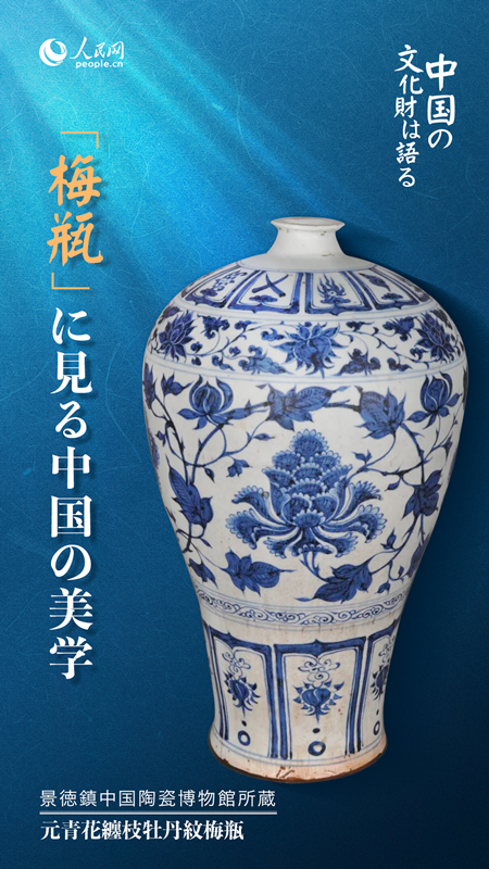 「元青花纏枝牡丹紋梅瓶」は、元の時(shí)代に景徳鎮(zhèn)で生まれた「元青花」と呼ばれる染付技術(shù)が生かされ、その美しさにさらに磨きがかけられた。一面に文様が施された構(gòu)図で、文様の層が多いものの亂雑な印象はない。染付で文様が上から下まで5層にも及んで描かれており、幾代にもわたって末永く続くようにという願いが込められている。(編集KN)