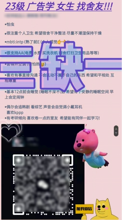珠??萍紝W院では數(shù)年前から寮の部屋を選ぶことができる機能を提供しており、今年も例年通り寮の選択が可能となっている。同學院の微信(WeChat)の新入生グループチャットでは、多くの學生が自分のプロフィールを紹介してルームメイト探しをしている。