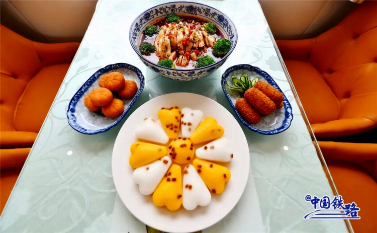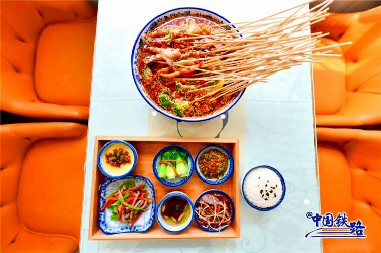 また食事を見てみると、食堂車では、串に刺した食材を煮てピリ辛ダレに漬けた「冷鍋串串」や「鉢鉢鶏」のほか、冷やし麺、餃子、酸っぱ辛い極太春雨ヌードルの「酸辣粉」、パンダセット、カラフルなアイスクリームといった四川省のご當(dāng)?shù)廿哎毳幛峁─丹欷皮い?。その上、羊肉の串焼きや手抓飯(ポロ)、大盤鶏(鶏肉とジャガイモのスパイシー煮込み)といった新疆のご當(dāng)?shù)廿哎毳幛馓峁─丹?、旅客は自分の好みに合わせて注文することができる?/p>