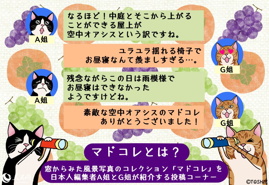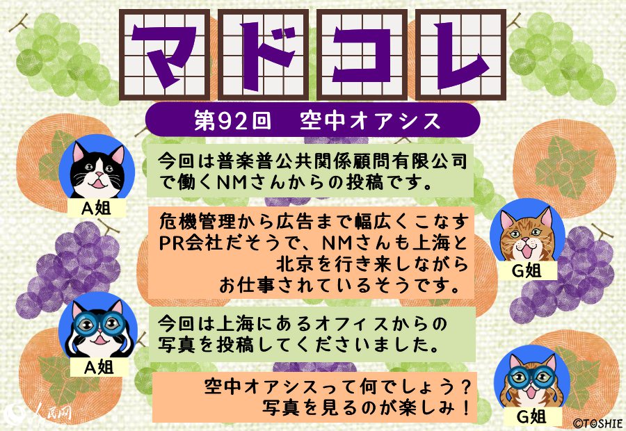 ウチのオフィスの窓からは、こんな風(fēng)景またはこんなモノが見えると自慢していただく「マドコレ(窓から見た風(fēng)景コレクション)」コーナー。どこまでも続く青い空や遠(yuǎn)くに見える山々といった自然の風(fēng)景から、オフィス街に建ち並ぶ高層ビルや幹線道路を走る車、庶民の暮らしが垣間見えるローカルな街並み、はたまた移動(dòng)中の車窓からの眺めなどなど、高さや場(chǎng)所も異なれば、その窓から眺める風(fēng)景も千差萬別。中には仕事の意欲をアップさせてくれる元?dú)荬纬訾牍饩挨猡ⅳ欷?、疲れを癒してくれるほっこりした風(fēng)景も。そんな皆さまからお寄せいただいたマドコレの數(shù)々を、毎週火曜日に、人民網(wǎng)日本人編集者のA姐とG姐がコメントしながら、のんびり紹介していきます。
