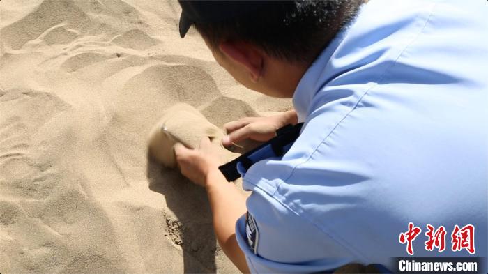 9月中旬に同派出所を取材すると、補(bǔ)助警官の張傑さんと同僚が金屬探知機(jī)を手にしながらゆっくりと砂山を行き來していた。そして「ピーッ」という音が鳴ると、ニコッと笑って屈み込み、手で砂を掘り始めると、ほどなく砂の中からスマホを見つけ出し、落とし主に、「こんな所から見つかりましたよ」と渡していた。