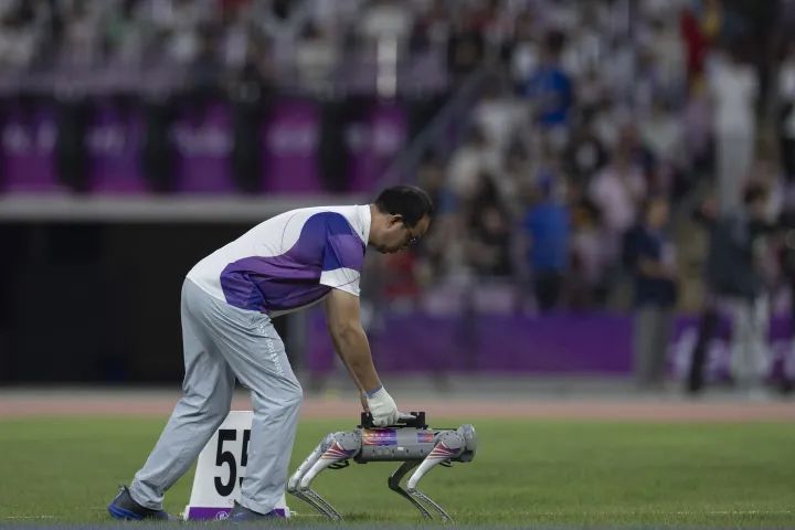 10月1日、同大會(huì)の陸上競(jìng)技の円盤投げのフィールドでは、數(shù)臺(tái)のロボット犬が円盤を運(yùn)びながら行き來(lái)していた。4本の足をちょこまかと動(dòng)かし、任務(wù)を終えると自ら「伏せ」をして、フィールド脇で次の指示を待っていた。