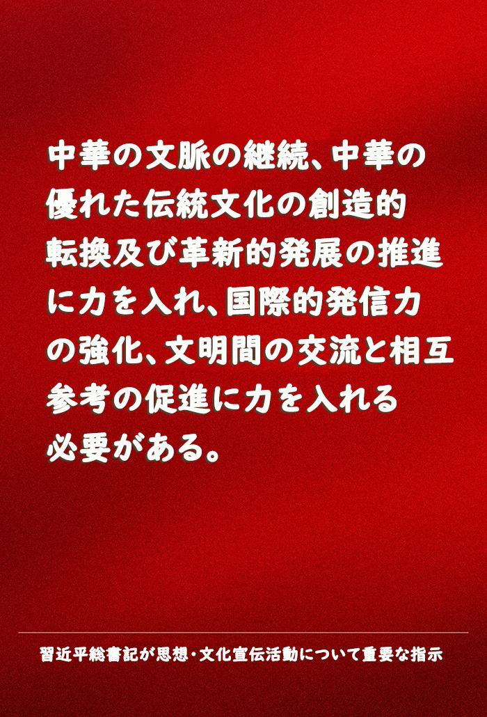 習(xí)総書記は「新時(shí)代の新たな道のりにおいて、百年間なかった世界の大きな変化が加速し、中華民族の偉大な復(fù)興が正念場(chǎng)に入り、戦略的なチャンスとリスクが併存する中、思想?文化宣伝活動(dòng)は新たな情勢(shì)と新たな任務(wù)に直面しており、新たな気概と新たな行動(dòng)が必須となっている。新時(shí)代の中國(guó)の特色ある社會(huì)主義思想による指導(dǎo)を堅(jiān)持し、第20回黨大會(huì)の精神を全面的に貫徹し、黨の革新理論を用いた全黨の指針、人民の教育という最も重要な政治的任務(wù)に焦點(diǎn)を合わせ、新たな歴史的出発點(diǎn)における文化的繁栄と文化強(qiáng)國(guó)の建設(shè)、中華民族現(xiàn)代文明の構(gòu)築の推進(jìn)継続という新たな文化的使命を中心に據(jù)え、文化的自信を揺るぎないものにし、開放?包摂性を堅(jiān)持し、正しい道を守りつつ革新を図る取り組みを堅(jiān)持し、思想?文化宣伝活動(dòng)に対する黨による指導(dǎo)の強(qiáng)化に力を入れ、強(qiáng)大な結(jié)束力と指導(dǎo)力を備えた社會(huì)主義イデオロギーの構(gòu)築に力を入れ、社會(huì)主義の核心的価値観を培い、実踐することに力を入れ、報(bào)道機(jī)関の発信力、指導(dǎo)力、影響力、信頼性の強(qiáng)化に力を入れ、中華の文脈の継続、中華の優(yōu)れた伝統(tǒng)文化の創(chuàng)造的転換及び革新的発展の推進(jìn)に力を入れ、文化事業(yè)と産業(yè)の繁栄と発展の推進(jìn)に力を入れ、國(guó)際的発信力の強(qiáng)化、文明間の交流と相互參考の促進(jìn)に力を入れ、全民族の文化的革新?創(chuàng)造の活力を存分に喚起し、全黨?全黨各民族の人々の団結(jié)?奮闘という共通の思想的基盤を固め続け、國(guó)家の文化的ソフトパワーと中華文化の影響力を高め続け、社會(huì)主義現(xiàn)代化國(guó)家の全面的建設(shè)と中華民族の偉大な復(fù)興の全面的推進(jìn)に強(qiáng)固な思想的保障、強(qiáng)大な精神的力、有利な文化的條件を與える必要がある」と強(qiáng)調(diào)。