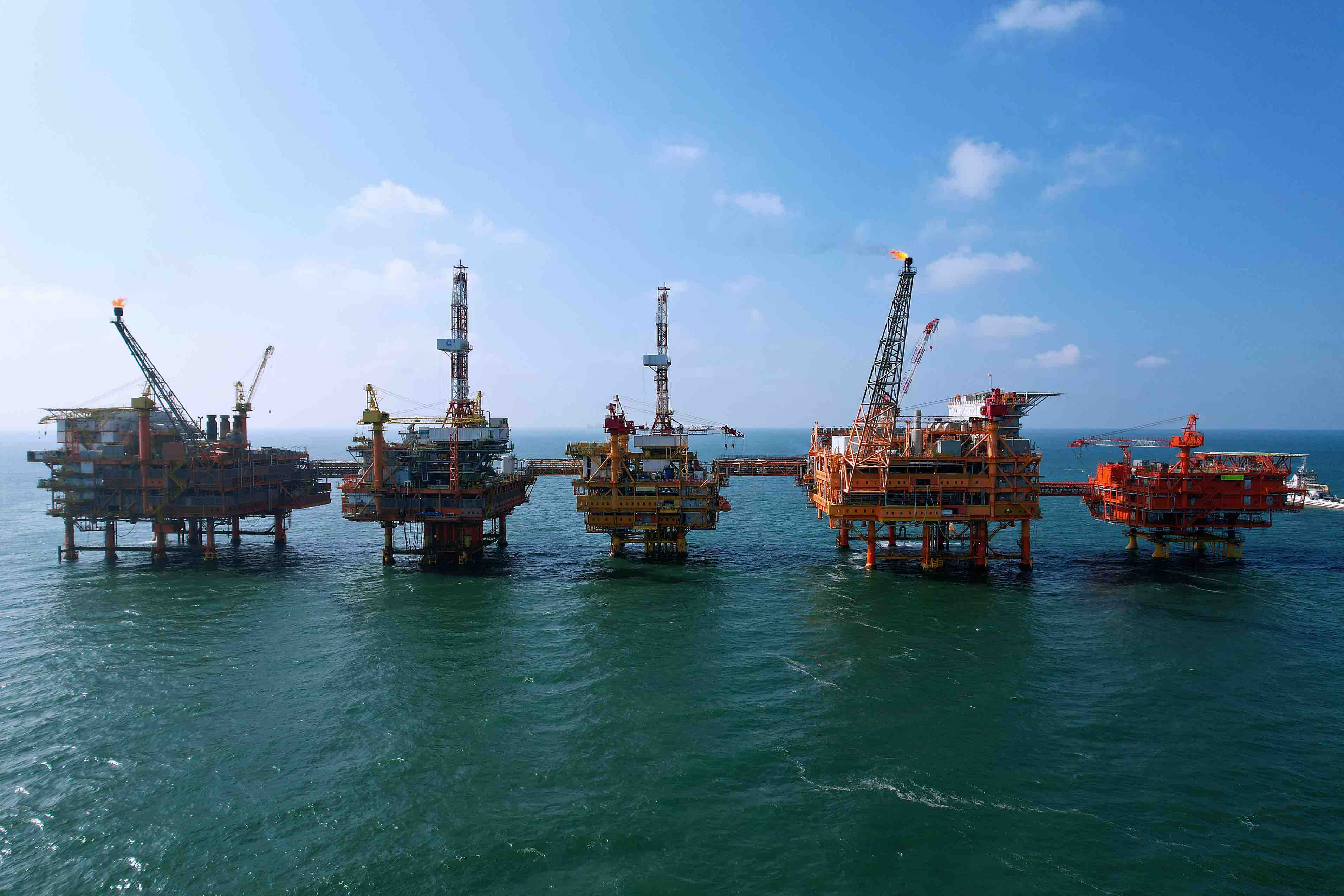 中國初の海上「5連星」プラットフォームが渤海油田で完成