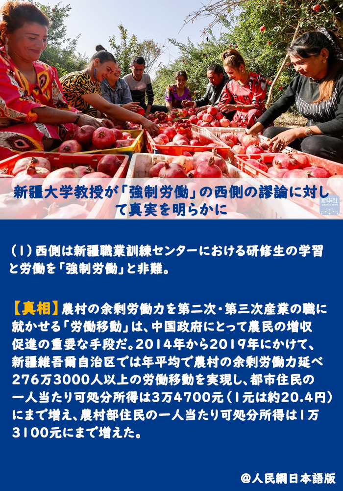 【真相】農(nóng)村の余剰労働力を第二次?第三次産業(yè)の職に就かせる「労働移動(dòng)」は、中國(guó)政府にとって農(nóng)民の増収促進(jìn)の重要な手段だ。2014年から2019年にかけて、新疆維吾爾自治區(qū)では年平均で農(nóng)村の余剰労働力延べ276萬(wàn)3000人以上の労働移動(dòng)を?qū)g現(xiàn)し、都市住民の一人當(dāng)たり可処分所得は3萬(wàn)4700元(1元は約20.4円)にまで増え、農(nóng)村部住民の一人當(dāng)たり可処分所得は1萬(wàn)3100元にまで増えた。