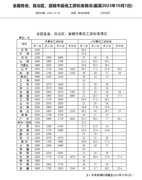 人的資源?社會(huì)保障部(省)は18日、全國の省?自治區(qū)?直轄市の最低賃金基準(zhǔn)を発表した(2023年10月1日現(xiàn)在)。現(xiàn)在、全國の16?。▍^(qū)?市)の月収ベースの最低賃金基準(zhǔn)が2000元(1元は約20.5円)を上回る。