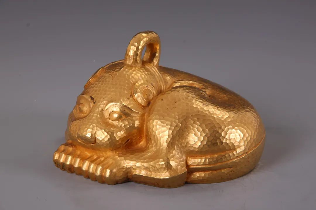 1982年2月、江蘇省盱眙県の南窯荘の穴蔵から総重量20キロ以上の金が出土した。その形や文字から、穴蔵に貯蔵されていた最古の物品は、前漢時(shí)代(紀(jì)元前206-8年)のものと見(jiàn)られている。発見(jiàn)された文化財(cái)38點(diǎn)のうち、この金獣は唯一無(wú)二で、その金の純度は99%と、正真正銘の「純金」で作られていた。これを作り上げるには、精製して純度を高める極めて高い技術(shù)が必要となる。その重さは9100グラムで、現(xiàn)時(shí)點(diǎn)で中國(guó)で出土した文化財(cái)の中で最も重い金器となっている。長(zhǎng)さは17.5センチ、幅は16センチと、生後2-3ヶ月の子ネコくらいの大きさになる。