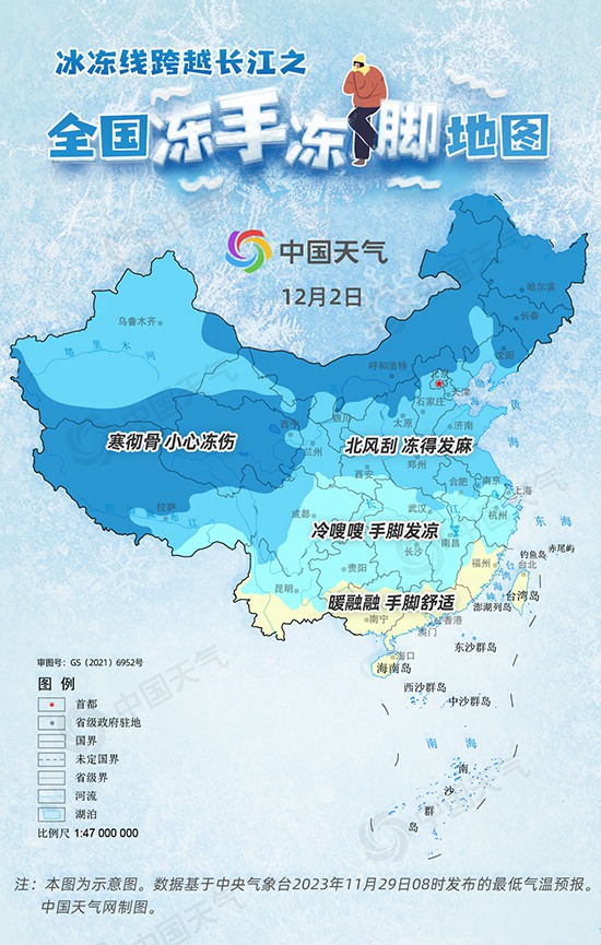 12月1日になると、寒気が引き続き南下して、北方エリアの大部分の気溫は今回の寒気襲來(lái)において最も低くなりそうだ。氷點(diǎn)下ラインは長(zhǎng)江を越えて、浙江省北部にまで到達(dá)する見込みだ。合肥や武漢、南京といった都市の気溫も今年下半期で最も低くなり、予想最低気溫は0度前後になる。