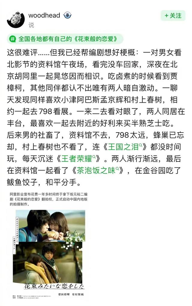 想像力豊かなネットユーザーは、中國(guó)各地のローカライズ版「花束みたいな戀をした」のシナリオを作成している。例えば、日本版で、麥と絹は、終電を逃し、一緒に入った深夜営業(yè)のカフェでたまたま人気映畫(huà)監(jiān)督の押井守が近くに座っているのを見(jiàn)つけ、それに気づいたのは自分たちだけだったため、互いにリスペクトし合うが、ネットユーザーが作成した北京版では、「北京風(fēng)モツ煮込みの鹵煮を食べている時(shí)に、賈樟柯(ジャ?ジャンクー)監(jiān)督に遭遇」というエピソードになっている。また、日本版では、麥と絹は初デートで、東京の科學(xué)博物館にミイラ展を見(jiàn)に行くのに対して、北京版では、「特別展を見(jiàn)るために798蕓術(shù)區(qū)に行く」エピソードに、上海版では、「上海國(guó)際映畫(huà)祭に行くチケットを協(xié)力して手に入れようと助け合う」エピソードで、互いの思いを深めている。