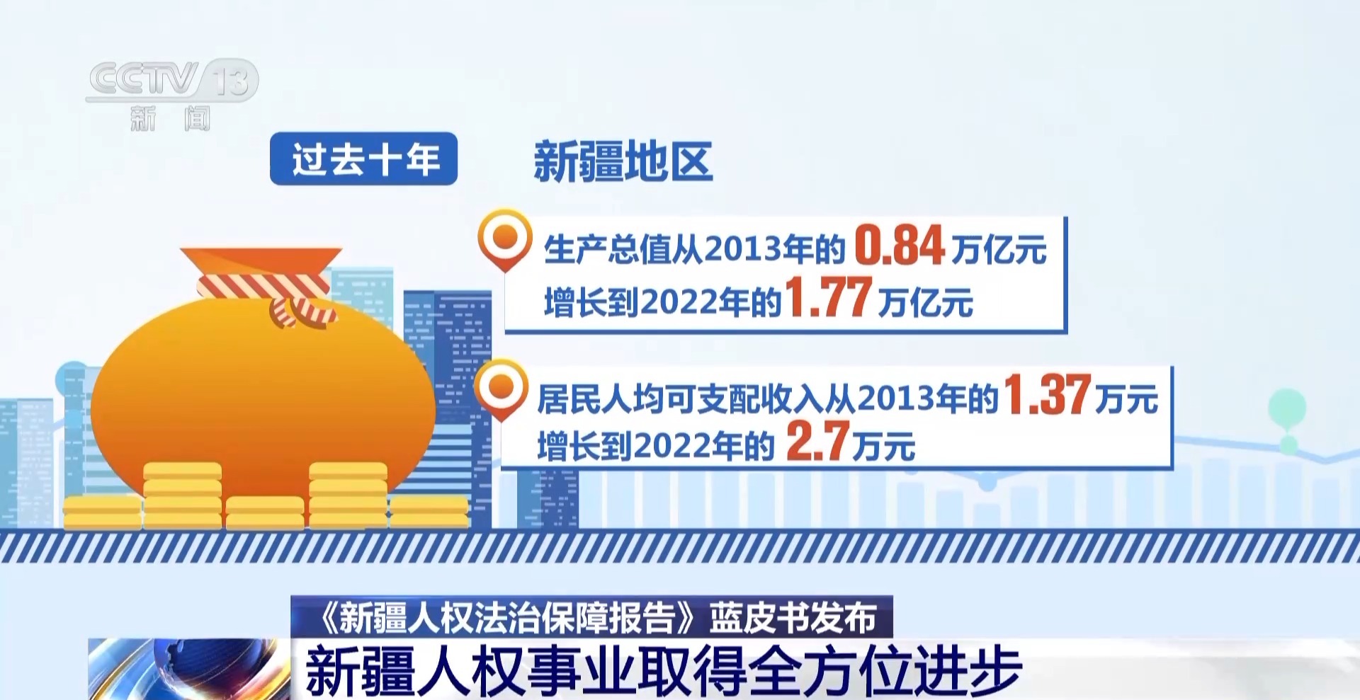 會議では、「新疆人権法治保障報告」青書の発表式も行われた。過去10年間で、新疆の域內(nèi)総生産(GRP)は2013年の8400億元(1元は約19.9円)から2022年には1兆7700億元へと増加し、住民の1人あたり可処分所得は2013年の1萬3700元から2022年には2萬7000元へと増加した。新疆を訪れた観光客數(shù)は2012年には延べ4860萬人だったが、今年は延べ2億6000萬人へと増加し、過去最多を記録した。新疆における人権事業(yè)の包括的な進歩と歴史的な成果は、現(xiàn)代中國の人権観の力強い実踐であり、これを生き生きと物語っている。(編集NA)