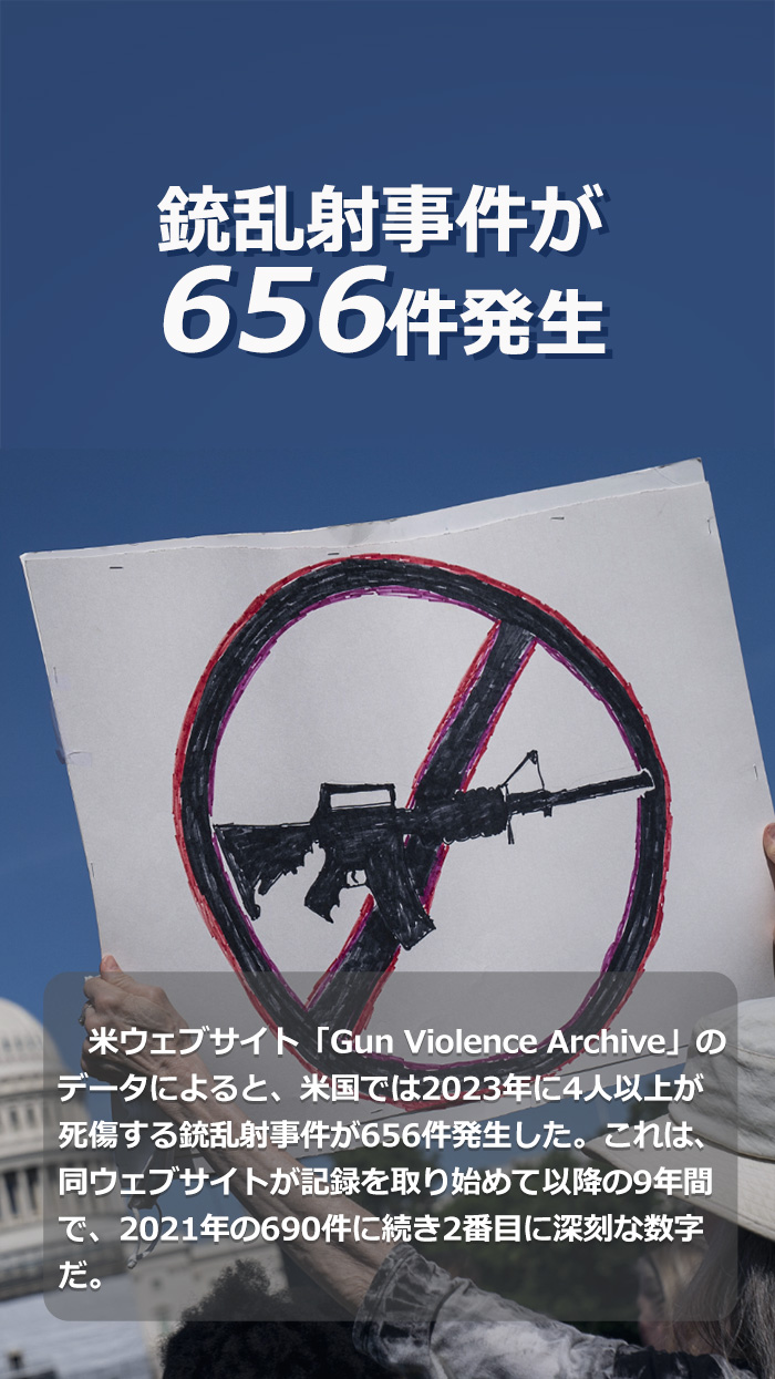 米ウェブサイト「Gun Violence Archive」のデータによると、米國では2023年に4人以上が死傷する銃亂射事件が656件発生した。これは、同ウェブサイトが記録を取り始めて以降の9年間で、2021年の690件に続き2番目に深刻な數(shù)字だ。