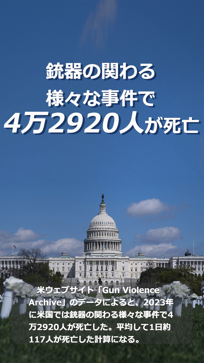 米ウェブサイト「Gun Violence Archive」のデータによると、2023年に米國では銃器の関わる様々な事件で4萬2920人が死亡した。平均して1日約117人が死亡した計算になる。