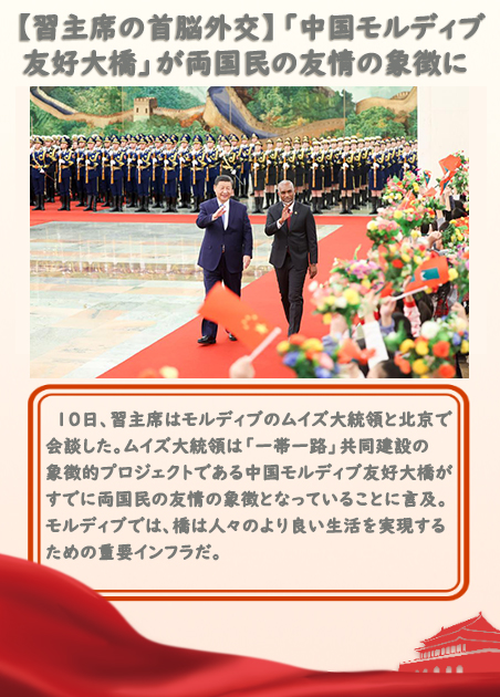 1月10日、習(xí)近平國(guó)家主席はムイズ大統(tǒng)領(lǐng)と北京の人民大會(huì)堂で會(huì)談した。ムイズ大統(tǒng)領(lǐng)は、「一帯一路」共同建設(shè)を始めとする中國(guó)との協(xié)力によってモルディブ國(guó)民が大きな利益を得ており、中國(guó)モルディブ友好大橋がすでに両國(guó)民の友情の象徴となっていることに特に言及した。