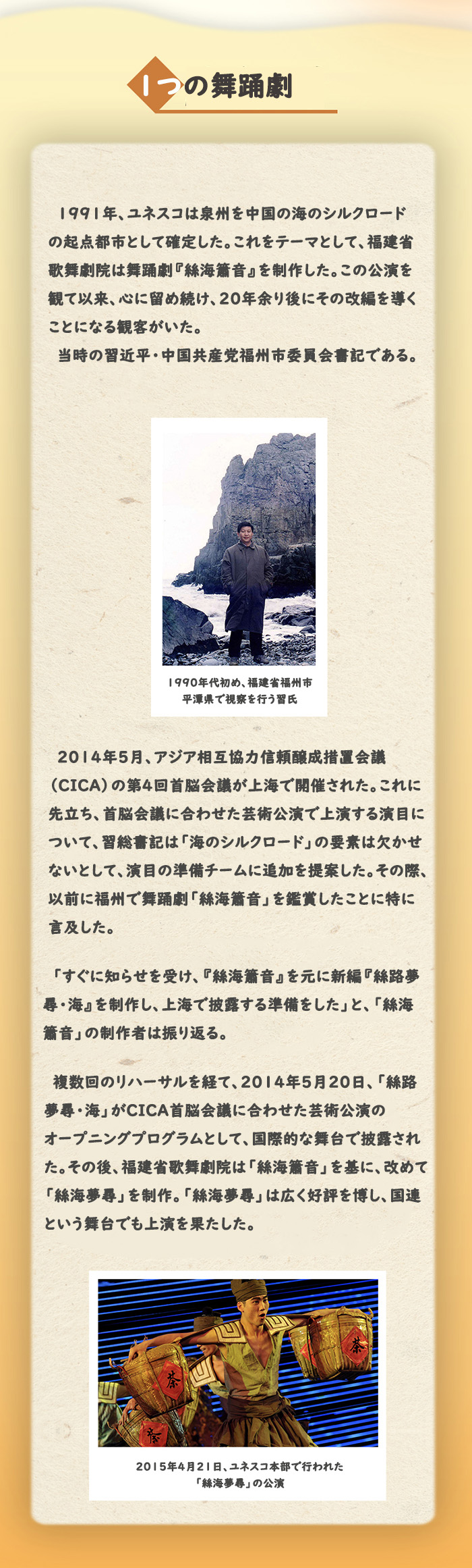 2014年5月、アジア相互協(xié)力信頼醸成措置會(huì)議(CICA)の第4回首脳會(huì)議が上海で開催された。これに先立ち、首脳會(huì)議に合わせた蕓術(shù)公演で上演する演目について、習(xí)総書記は「海のシルクロード」の要素は欠かせないとして、演目の準(zhǔn)備チームに追加を提案した。その際、以前に福州で舞踴劇「絲海簫音」を鑑賞したことに特に言及した。