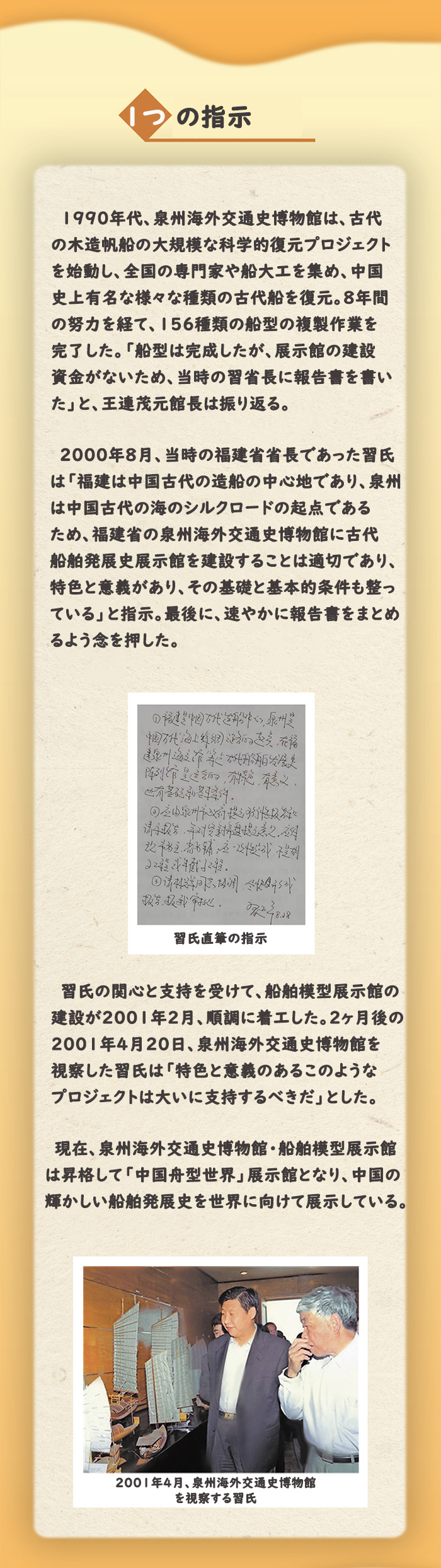 2000年8月、當(dāng)時(shí)の福建省省長(zhǎng)であった習(xí)氏は「福建は中國(guó)古代の造船の中心地であり、泉州は中國(guó)古代の海のシルクロードの起點(diǎn)であるため、福建省の泉州海外交通史博物館に古代船舶発展史展示館を建設(shè)することは適切であり、特色と意義があり、その基礎(chǔ)と基本的條件も整っている」と指示。最後に、速やかに報(bào)告書をまとめるよう念を押した。