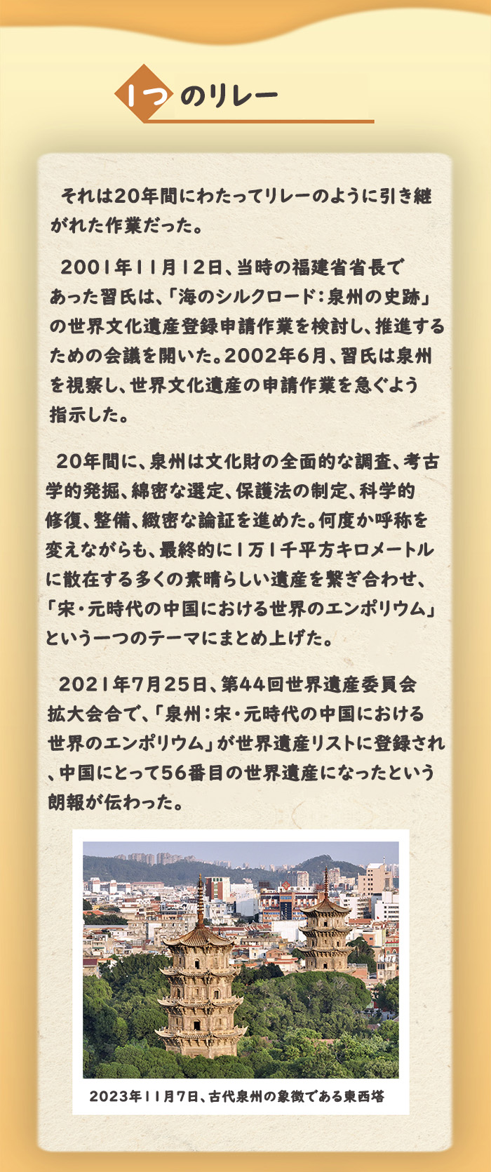 2001年11月12日、當(dāng)時(shí)の福建省省長(zhǎng)であった習(xí)氏は、「海のシルクロード:泉州の史跡」の世界文化遺産登録申請(qǐng)作業(yè)を検討し、推進(jìn)するための會(huì)議を開いた。2002年6月、習(xí)氏は泉州を視察し、世界文化遺産の申請(qǐng)作業(yè)を急ぐよう指示した。