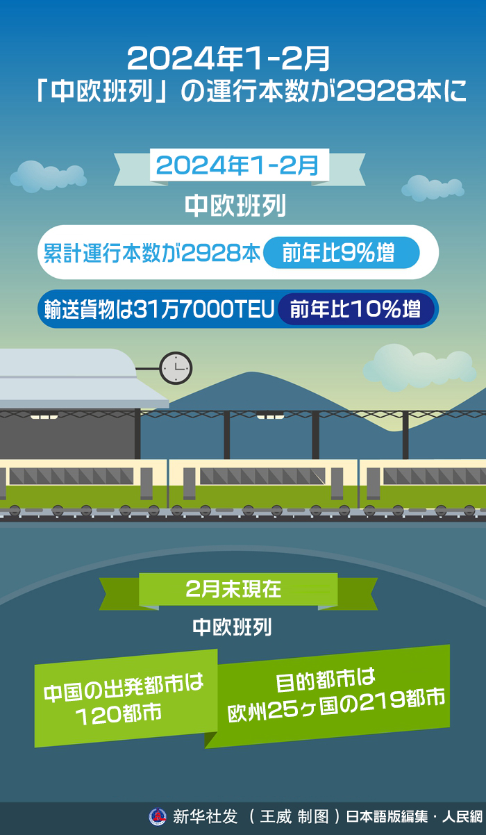 中國(guó)國(guó)家鉄路集団有限公司が10日、「今年1-2月には、國(guó)際定期貨物列車(chē)『中歐班列』の累計(jì)運(yùn)行本數(shù)が前年同期比9%増の2928本、輸送貨物は同10%増の31萬(wàn)7000TEU(20フィート標(biāo)準(zhǔn)コンテナ換算)に達(dá)した。2月末現(xiàn)在、「中歐班列」は中國(guó)の120都市と歐州25ヶ國(guó)の219都市を結(jié)んでいる」と明らかにした。