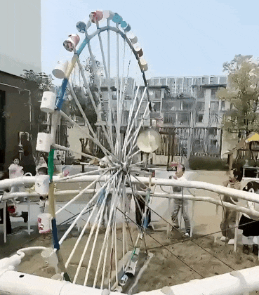 浙江省杭州市臨平區(qū)にある星光幼稚園では3月14日、園児たちが観覧車(chē)のような水車(chē)で夢(mèng)中になって遊んでいた。この水車(chē)は、同園で警備員をしている朱國(guó)良さんが、6日間かけて作ったもので、32人の園児が同時(shí)に水を汲み上げることができる。朱さんは5年前から同園の警備員となり、夏休みを利用して、動(dòng)物の噴水や水循環(huán)自転車(chē)、水車(chē)、人力回転?zāi)抉Rなどを次々作ってきたという。(編集KM)