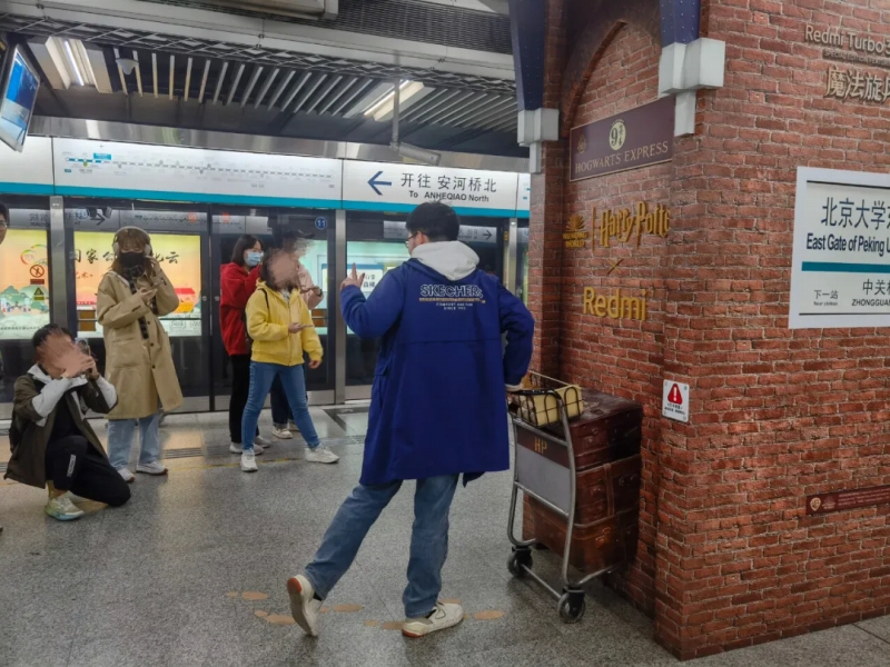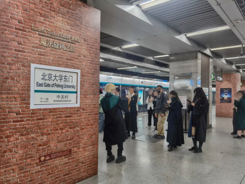 同日午後に北京大學東門駅を訪れると、プラットホームの中央付近が「9と3/4番線」プラットホームになっていた。中央通路では柱がすべて赤レンガ柄のポスターで覆われ、一番真ん中の2本の柱のところには、映畫と同じように壁に吸い込まれるカートがあり、赤色のトランクが3個置かれ、カートの中には丸められた紙が入っていた。地下鉄駅全體がレトロの魔法をかけられたようで、大勢の乗客がカメラに収めていた。