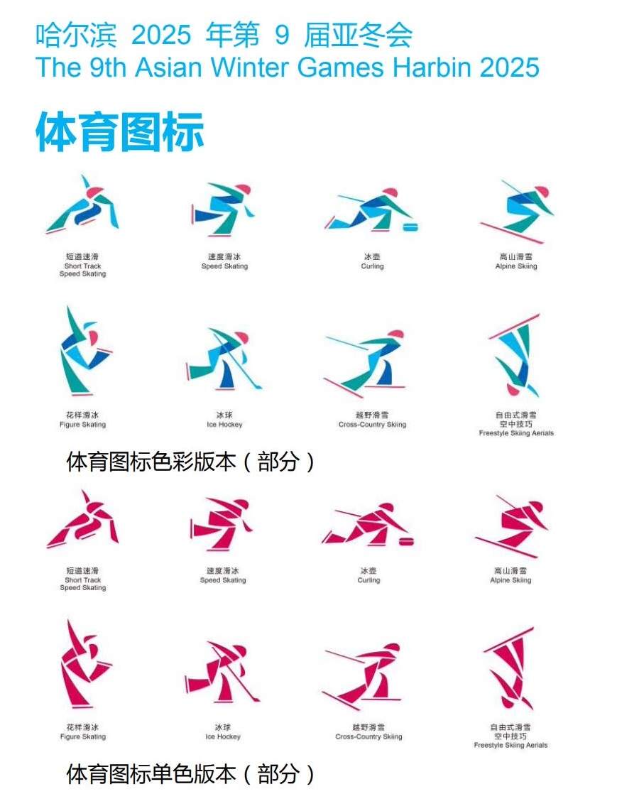 スポーツピクトグラムは、エンブレムのテーマ「超越(Breakthrough)」をベースにデザインされ、そのビジュアルスタイルを採(cǎi)用。各競(jìng)技の體の動(dòng)きとエンブレムのデザインコンセプトを組み合わせており、エンブレムが表現(xiàn)しているアジアのウィンタースポーツアスリートが、自己ベストを更新できるよう、力の限りを盡くして戦うスポーツマンシップが反映されている。スポーツピクトグラムは16種類(lèi)で、力強(qiáng)くスタイリッシュ、アグレッシブ、そして躍動(dòng)感があるデザインとなっており、生き生きとしていて、かつ的確なイメージで冬季アジア大會(huì)の各競(jìng)技を表現(xiàn)している。