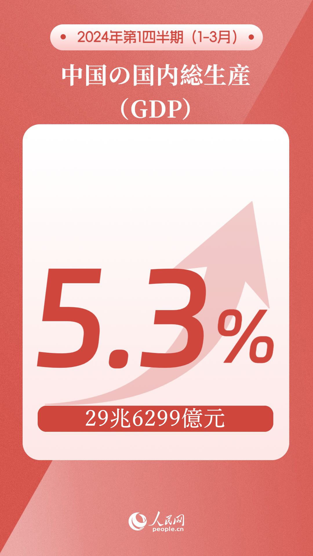 中國國家統(tǒng)計局が16日に発表した統(tǒng)計によると、今年第1四半期(1-3月)の國內(nèi)総生産(GDP)の速報値は29兆6299億元(1元は約21.3円)となり、不変価格で計算すると、前年同期比5.3%増加し、2023年第4四半期(10-12月)より1.6%増加した。