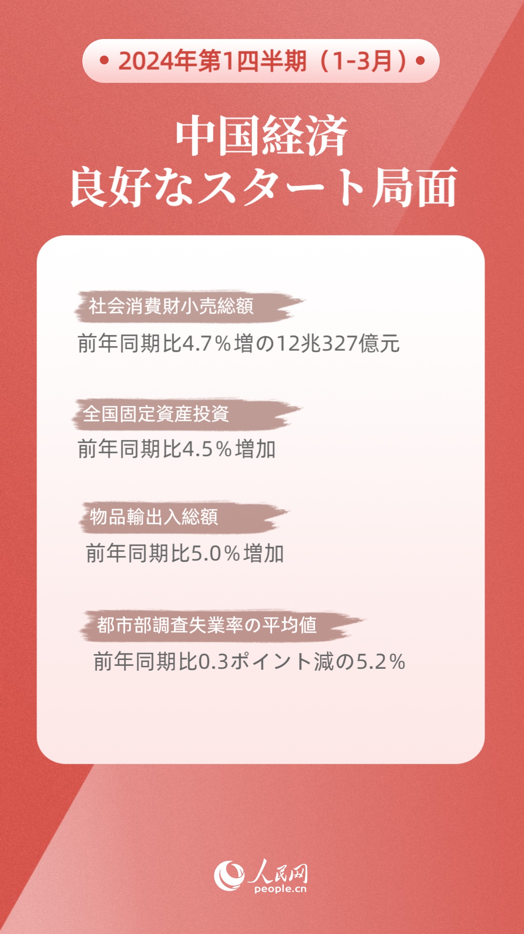 第1四半期、社會消費財小売総額は12兆327億元で、前年同期比で4.7%増加した。全國固定資産投資(農(nóng)家を含まず)は前年同期比4.5%増加、物品輸出入総額は前年同期比5.0%増加した。全國の都市部調(diào)査失業(yè)率の平均値は5.2%で、前年同期比0.3ポイント減少した。生産需要は安定の中で増加し、質(zhì)の高い発展は新たな成果を収め、國民経済は回復(fù)?好転基調(diào)を継続し、好スタートを切った。