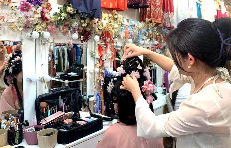 そして思いがけなかったことに、トレーニングクラスを卒業(yè)したその日のうちに、家の近くの漢服體験館で働くことが決まったという。「働き始めたばかりの時は1人のメイクアップに1-2時間もかかっていた。でも、少しずつ慣れていき、今ではオンシーズンになると、1日に1千元(1元は約21.7円)以上稼げるようになった」と話す。