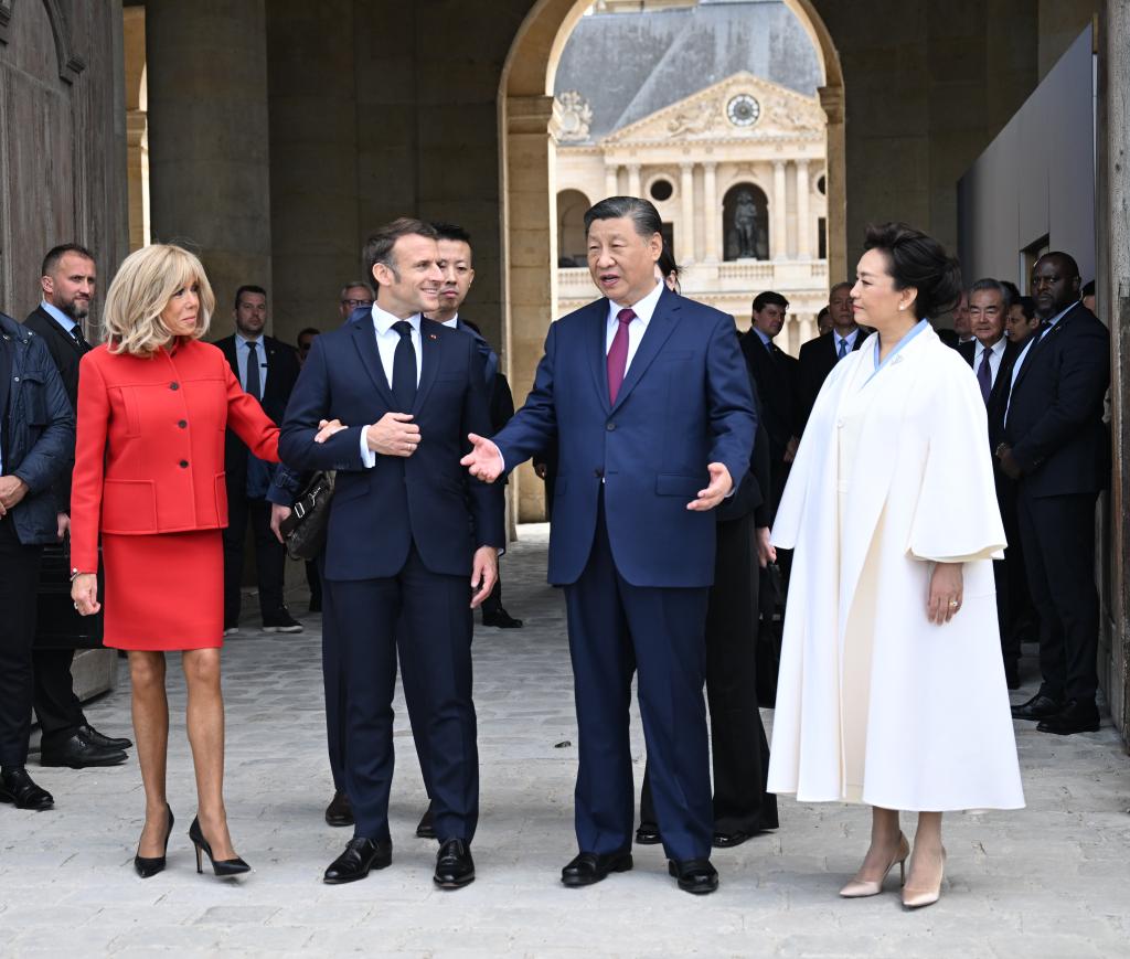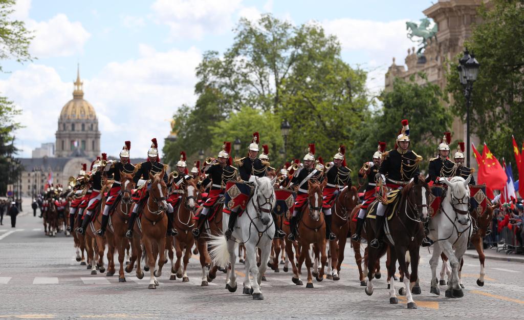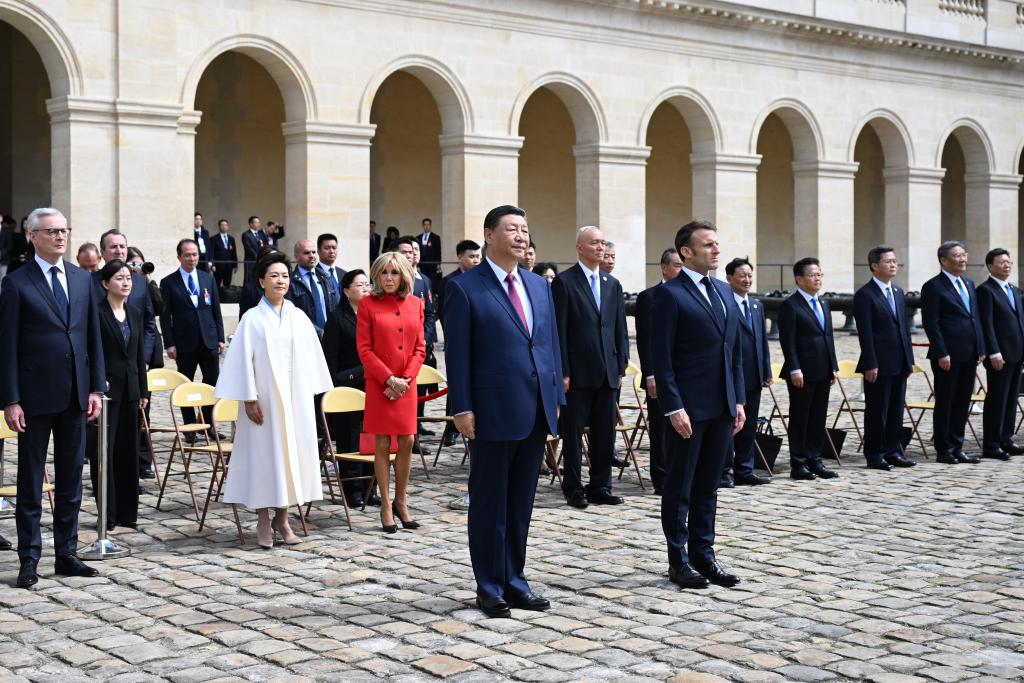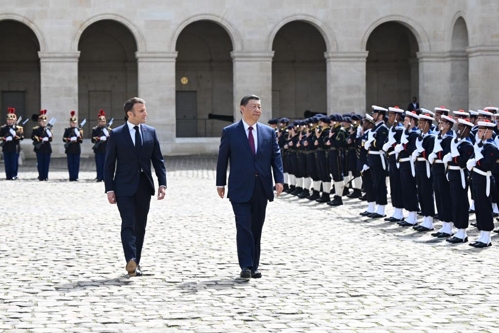 同日午後、習(xí)主席はパリでマクロン大統(tǒng)領(lǐng)主催の盛大な歓迎式典に出席した。両國(guó)首脳はフランス共和國(guó)護(hù)衛(wèi)隊(duì)及び陸??杖妰x仗隊(duì)を閲兵し、分列式を観閲した。